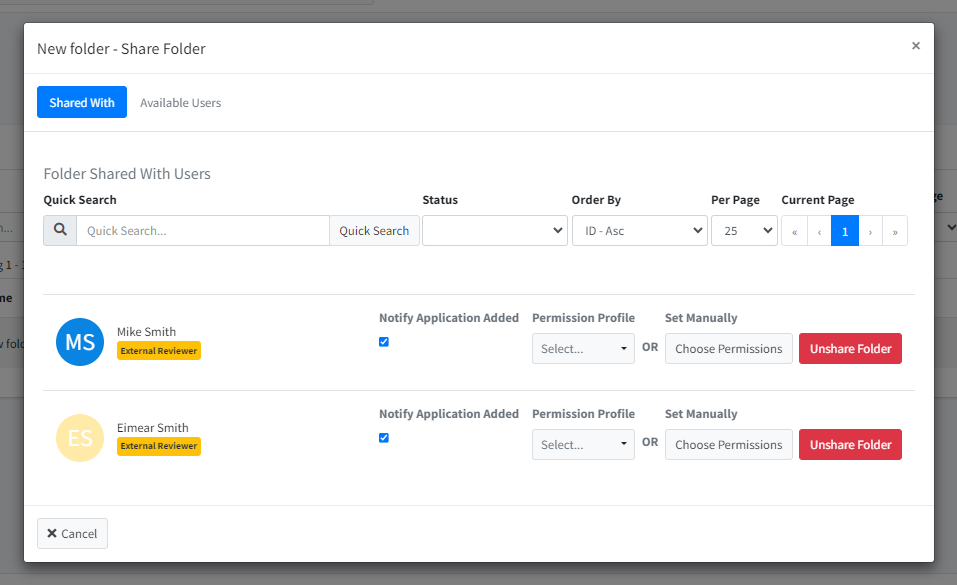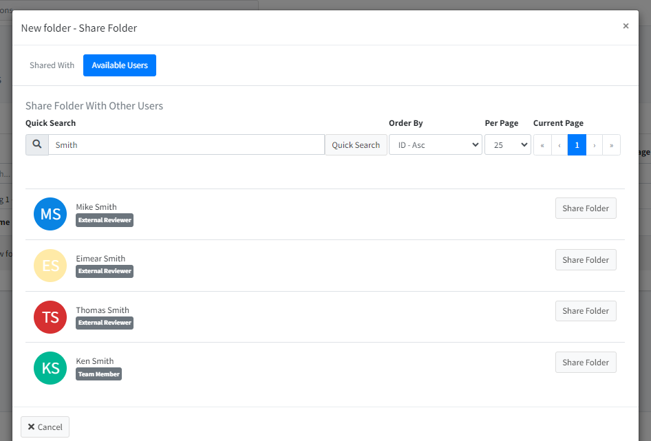 - Share the folder: A list of available users opens up, and you can select with whom you would like the folder shared with: team leaders, team members, or external reviewers. An email is sent to inform the user that a folder has been made available to them.