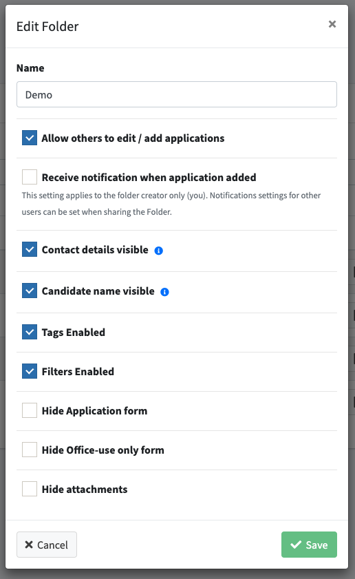 - The Edit button reopens the folder setup dialog box- You can make changes to your folder in the this section. You can change the folder name, privacy settings, and other details. You can also choose to allow or restrict team members from adding applications to the folder. If you want to restrict contact details from your external reviewers, you can choose to hide the email address and phone question options. You can also choose to hide tags and candidate names from your team members.