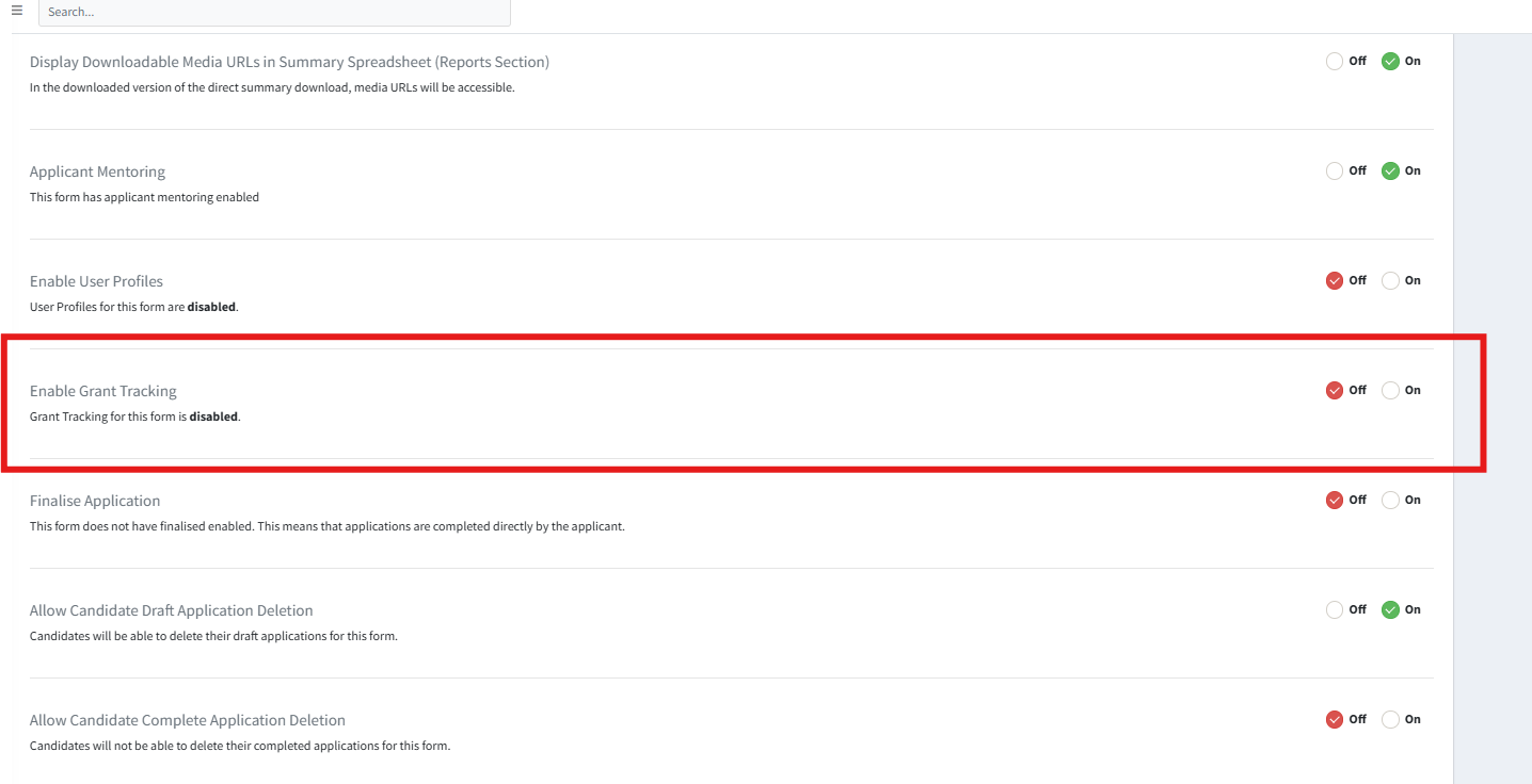 Select the ‘Settings’ tab, and scroll down the General settings until you find the ‘Enable Grant Tracking’ setting: