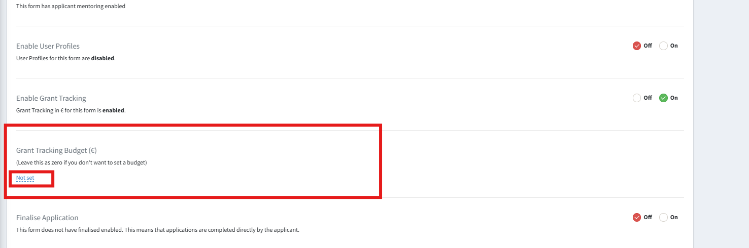 Toggle the Grant tracking setting to ‘On’, and a new setting will appear called ‘Grant Tracking Budget’. Click on ‘Not set’ to enter an amount, then click the blue tick icon: