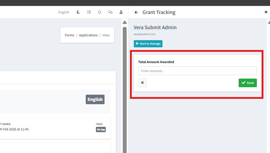 You will then be asked to enter the Total Amount Awarded to the Applicant. Enter the amount, and click ‘Save’: