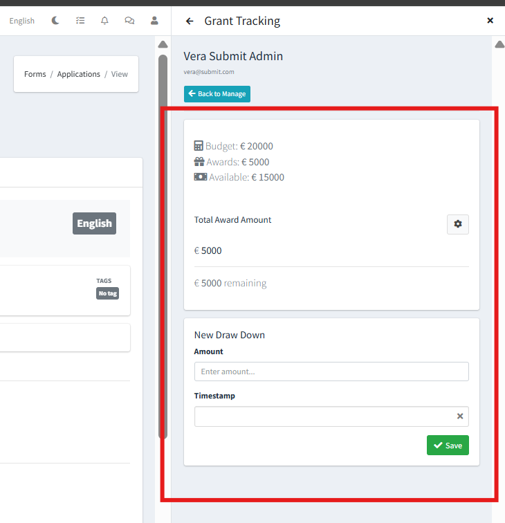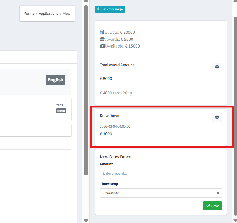If the Grant is being distributed in stages to the Applicant, you will be able to enter the individual amounts in the ‘New Drawdown’ section:
