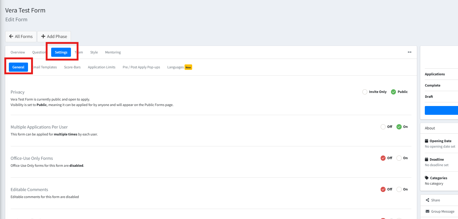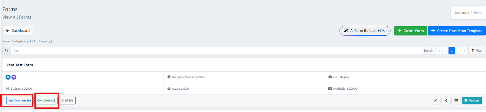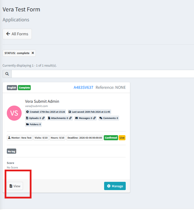 Click on ‘Applications’ or on ‘Complete’ on a Form: